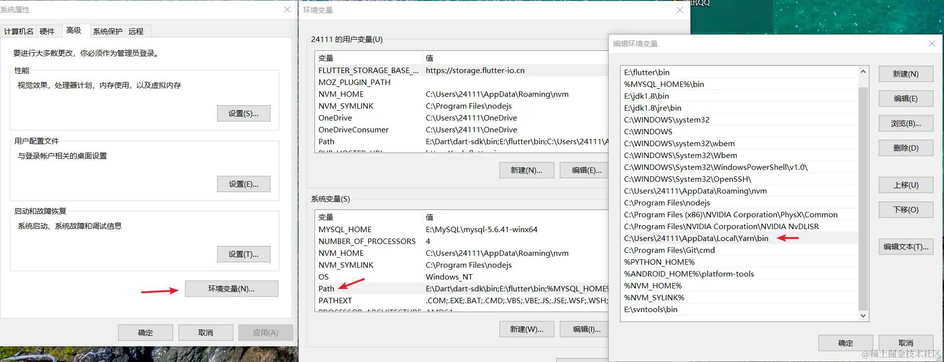 打开环境 => 新建 path => 复制粘贴执行上一步获得的yarn安装路径