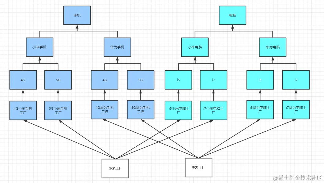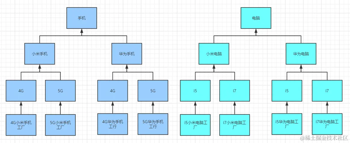 我们有个手机这个产品的抽象接口,我们的产品分别是小米手机和华为手机