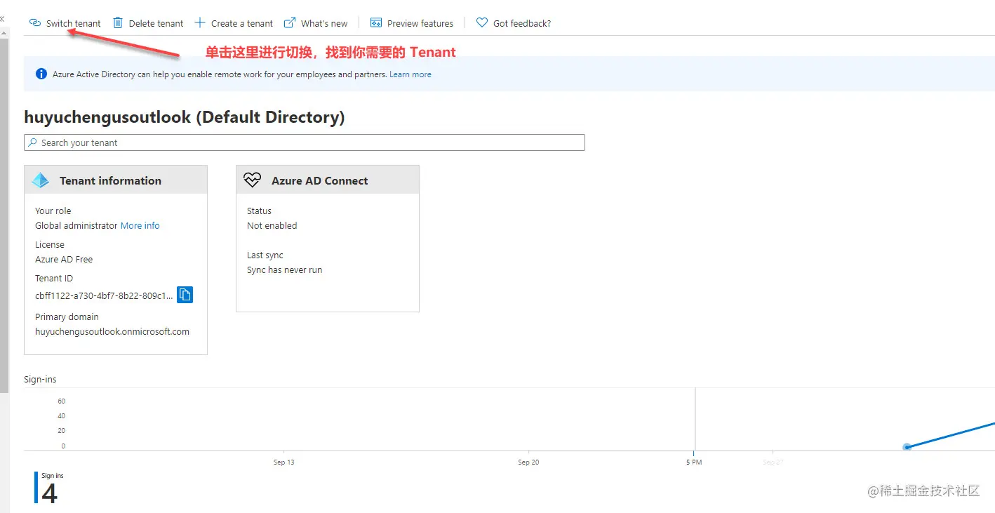 Azure 允许你有多个 tenant,你可以在 Azure 的控制台中对 tenant 进行切换,这个是你需要做的第一步。确定你希望使用的 teant。