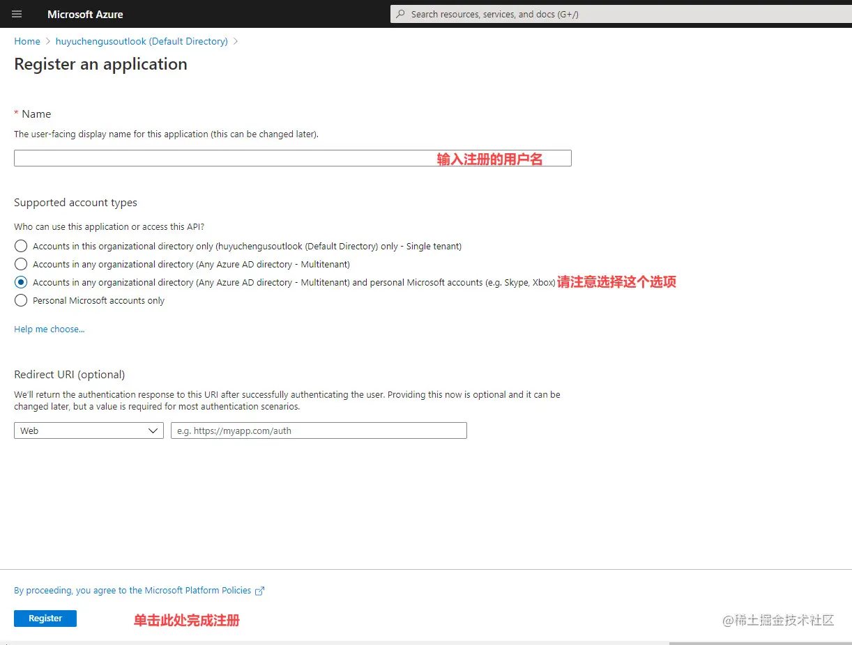 注册的名字你可以自行定义,需要注意的是,你需要选择: