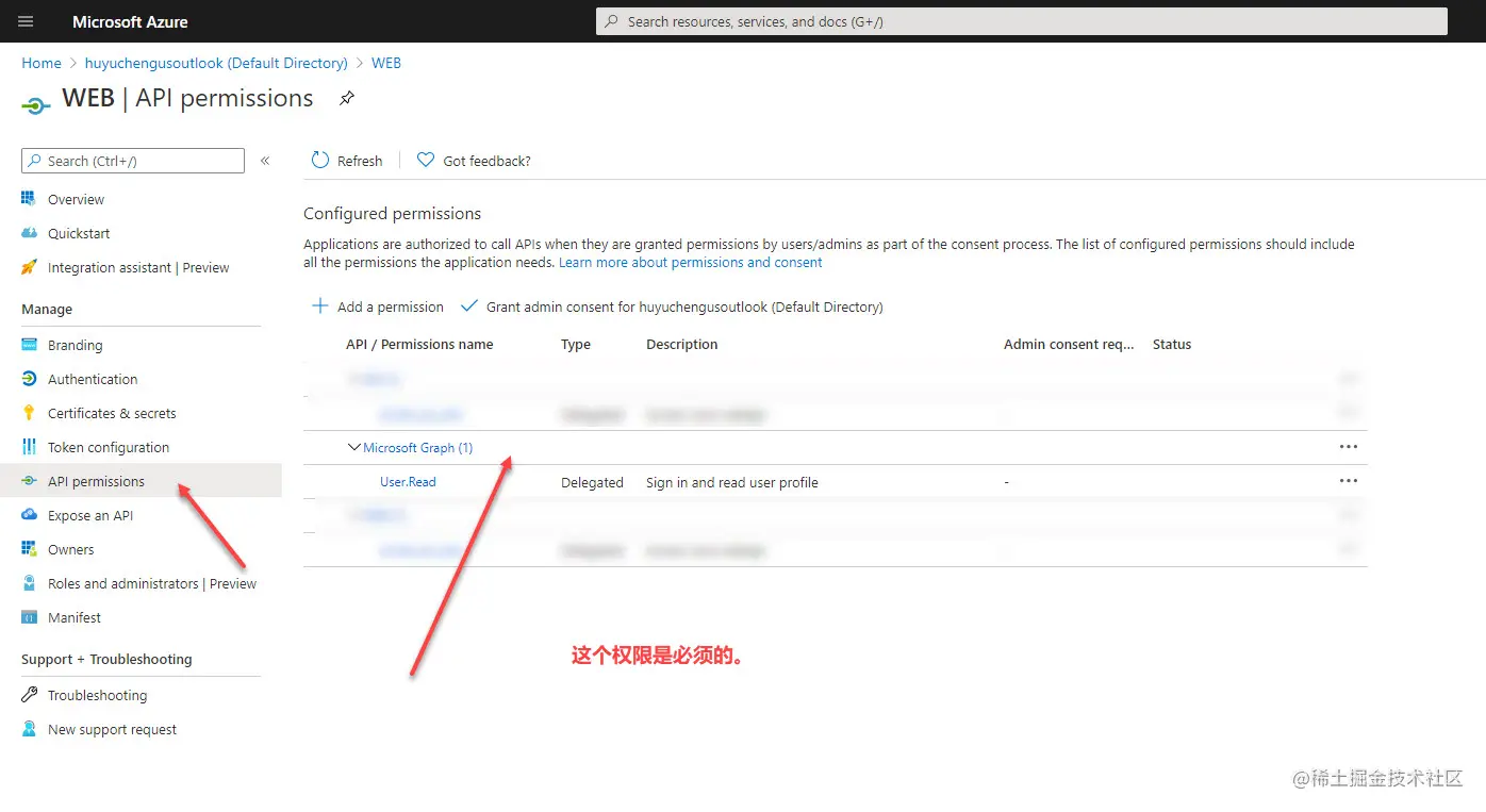 你需要确定 Microsoft Graph 有用户读取的权限。
