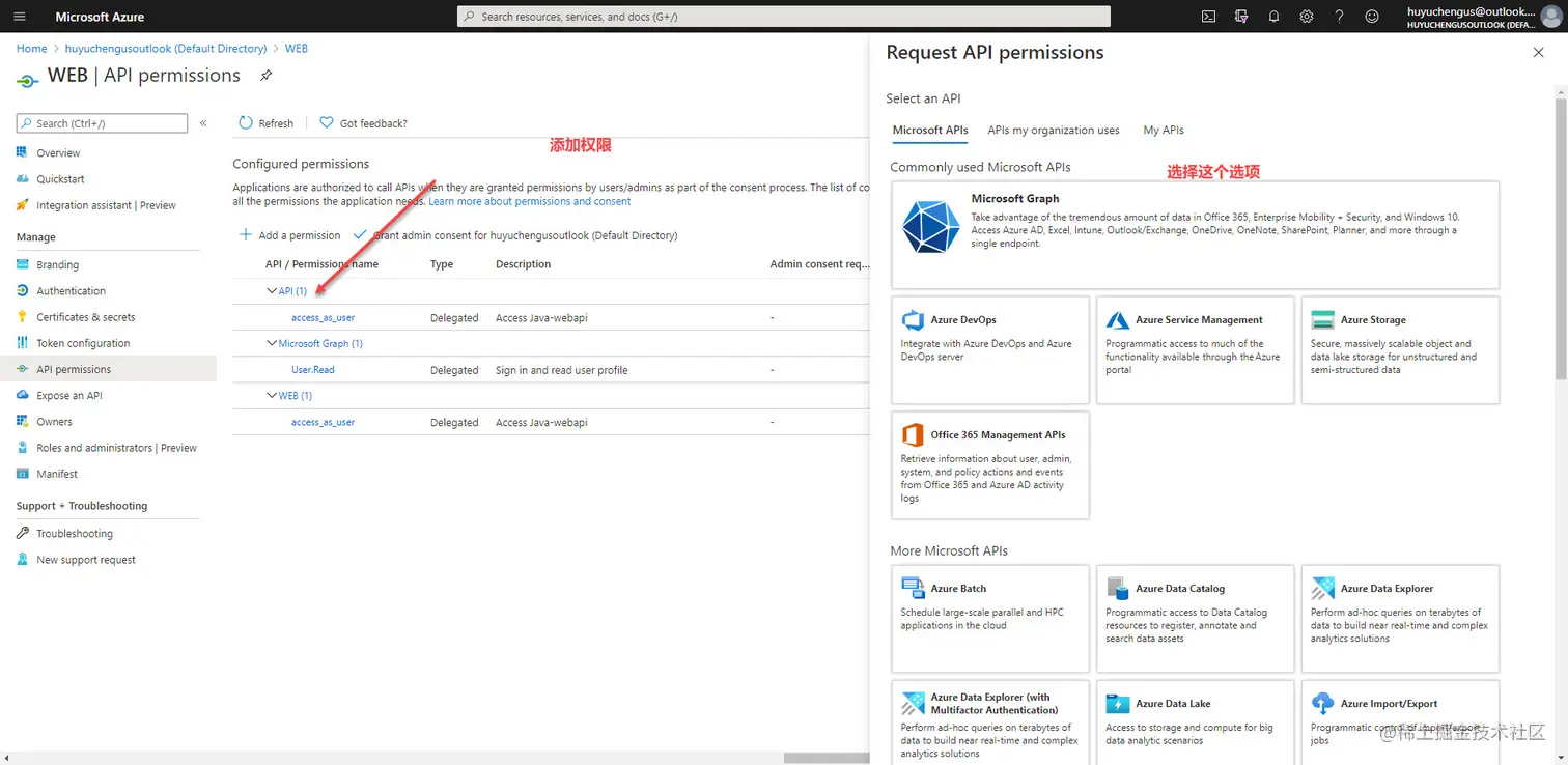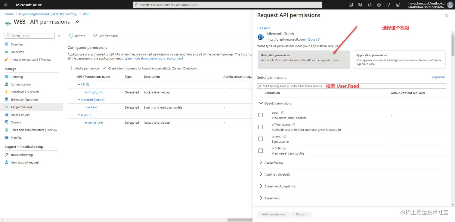 选择 Microsoft Graph 的选项,然后将用户的权限添加进来。