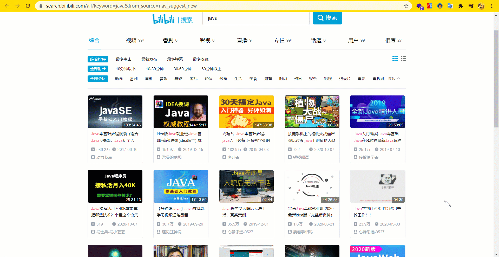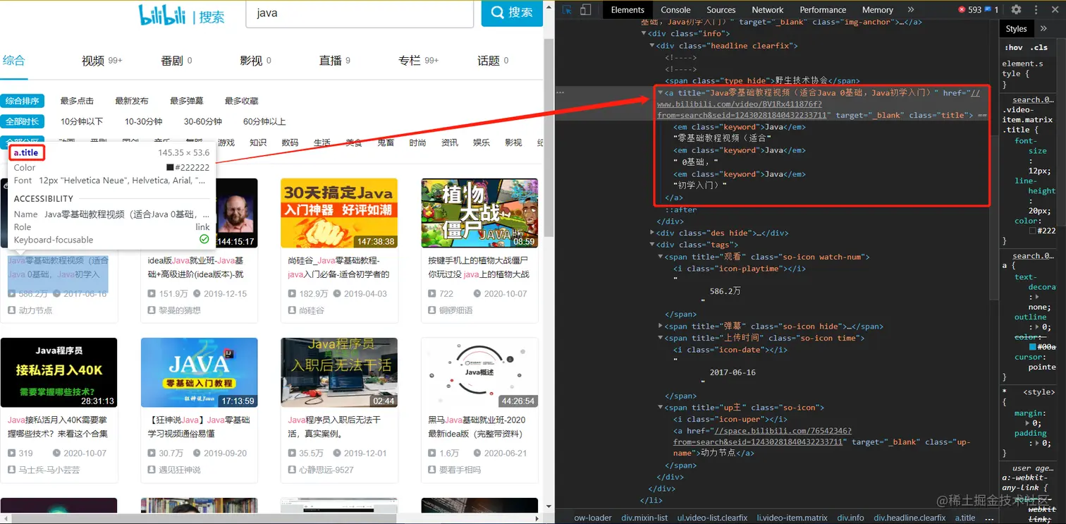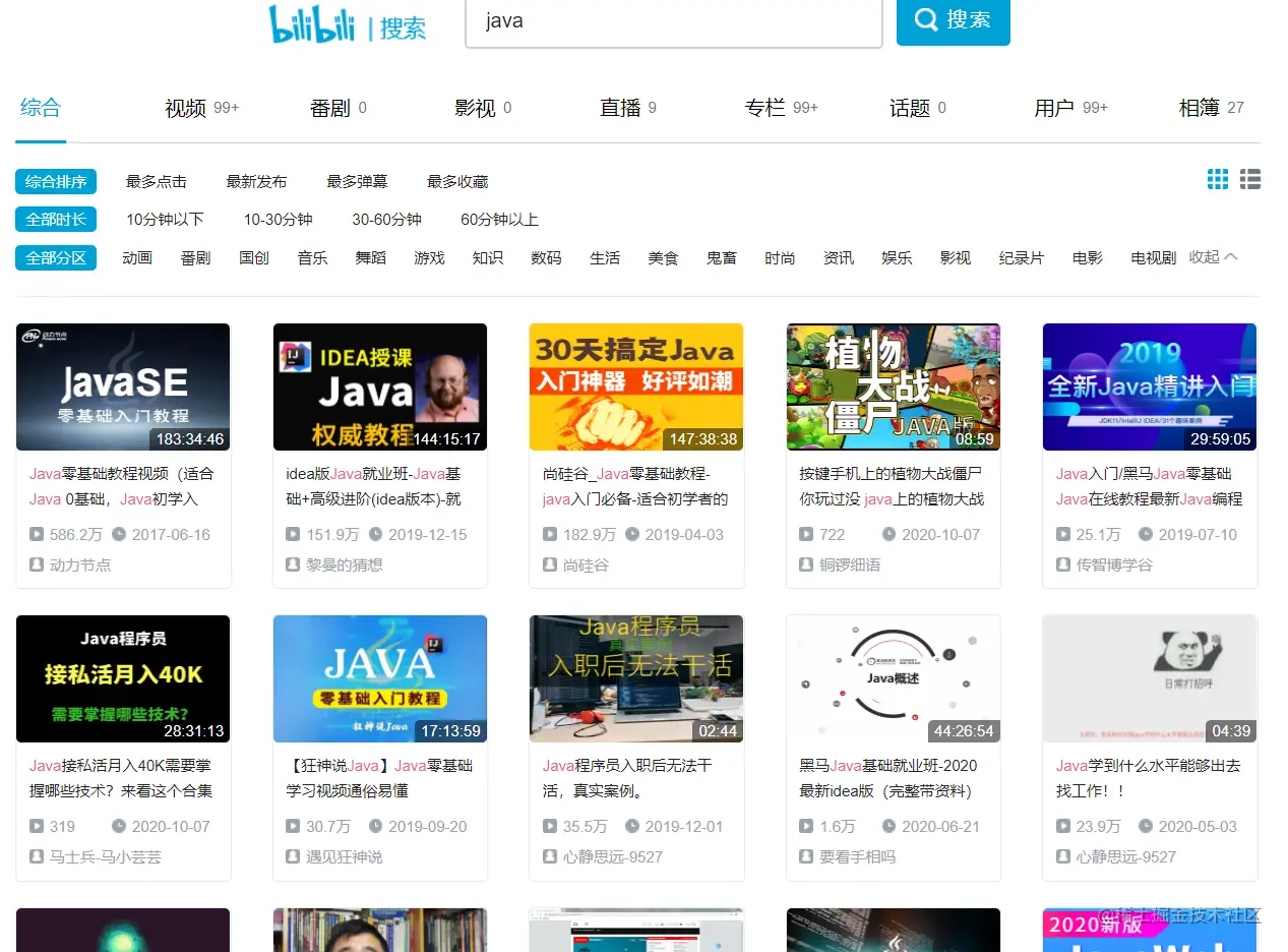 我们在 Bilibili 上搜索 Java 自然会返回给我们的结果,我们今天就是要把它返回给我们的结果数据通过 Java 程序给获取到。