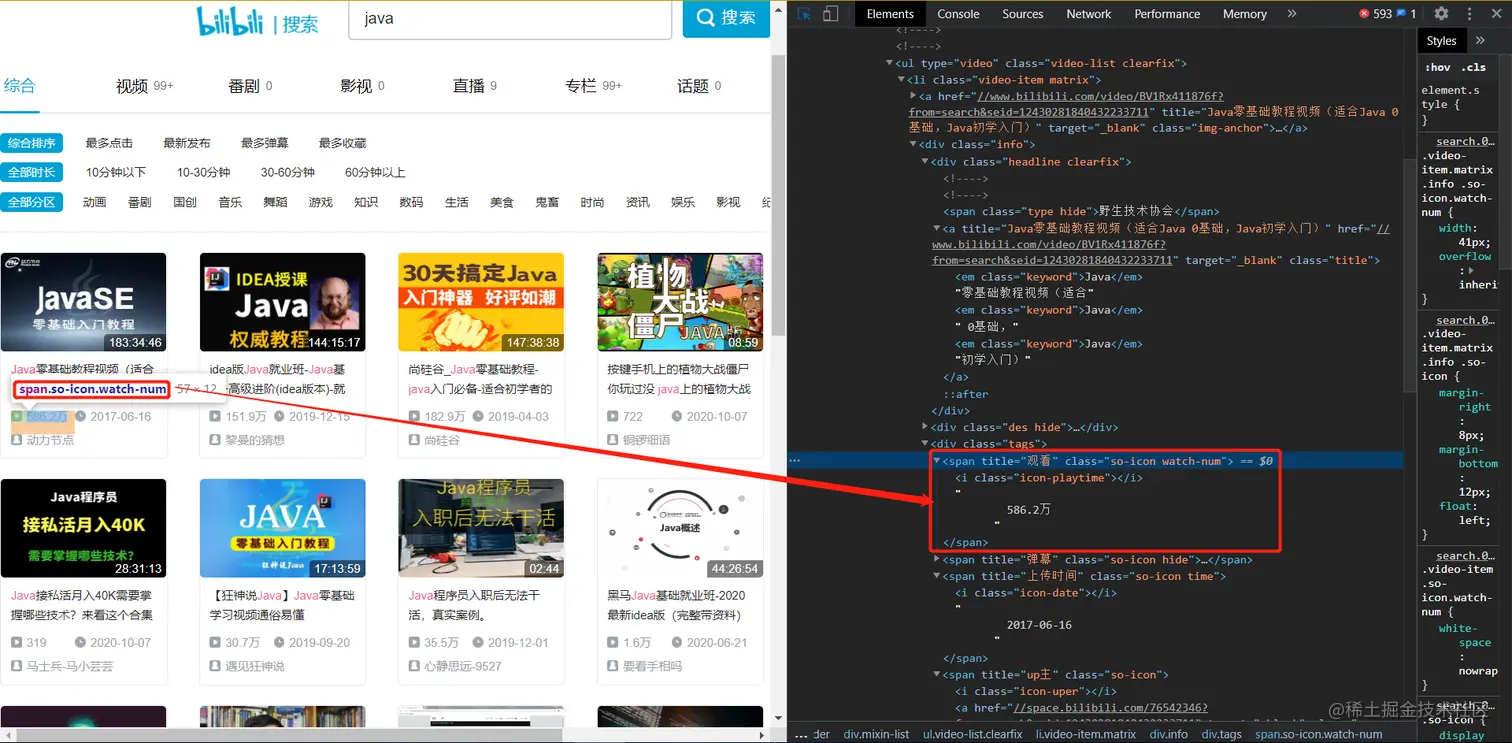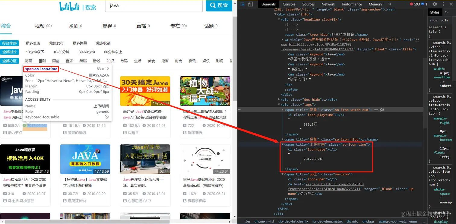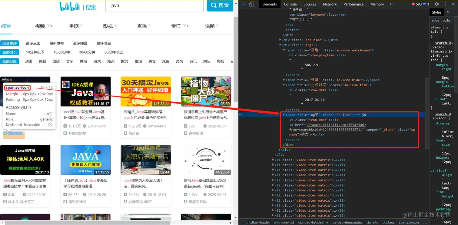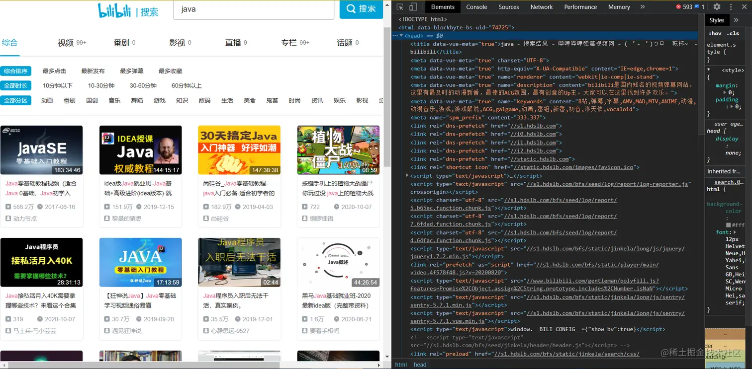 我们在 Bilibili 上搜索 Java 自然会返回给我们的结果,我们今天就是要把它返回给我们的结果数据通过 Java 程序给获取到。