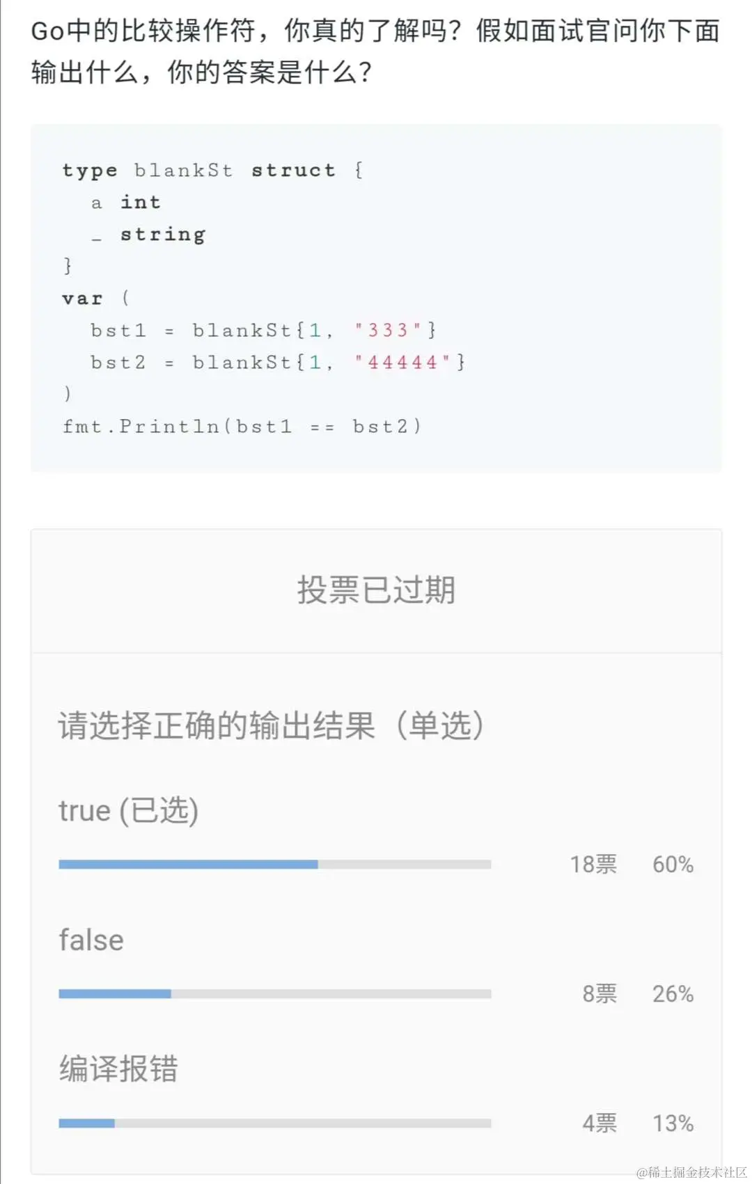 首先,笔者自己选择了true,所以实际结果是41%的读者都选择了错误的答案。看到这个结果,笔者相信上一篇文章还是能够帮助到大家。