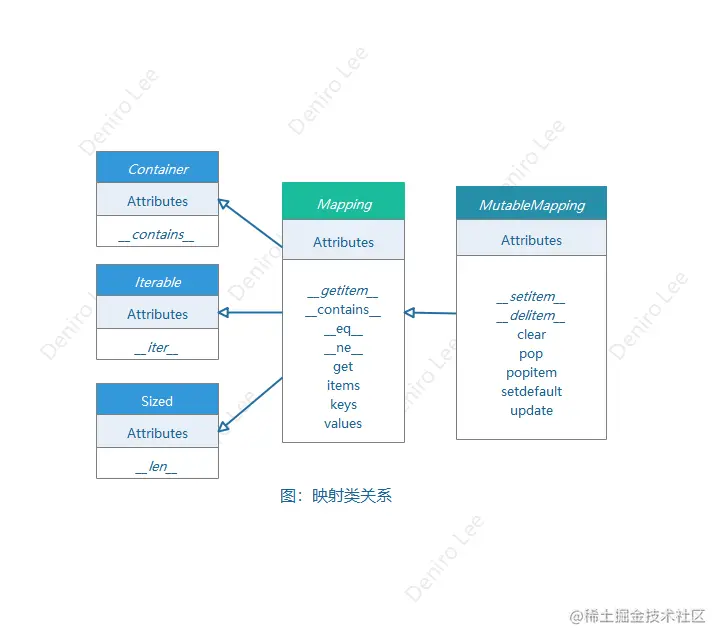 首先是 Container、Iterable 与 Sized 三大接口,接着 Mapping 接口在继承了前面三大接口的基础上,又定义了一些自有接口。