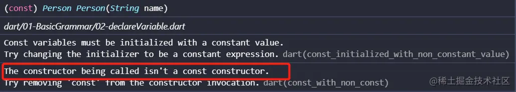 - 第二个错误(红色线条画出来的部分),当前的构造函数被调用的时候不是常量构造函数