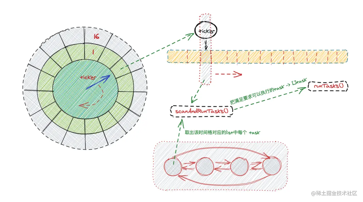 以上比较直观展示 timingWheel 的 “时间轮”,后面会围绕这张图解释其中推进的细节。
