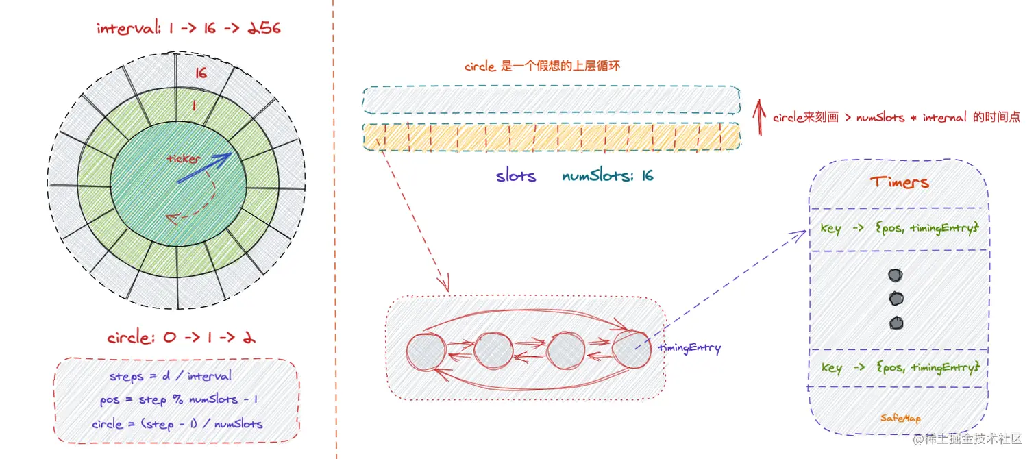 circle分层,这样就可以不断复用原有的numSlots,因为定时器在不断loop,而执行可以把上层的slot下降到下层,在不断loop中就可以执行到上层的task。这样的设计可以在不创造额外的数据结构,突破长时间的限制。