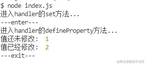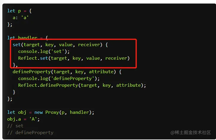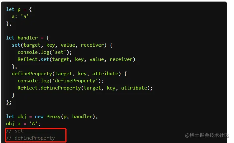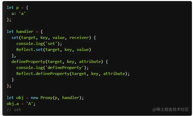 而传入receiver,则会将"修改"行为设置receiver对象上(receiver一般情况下为proxy对象),修改一个对象的属性底层调用的是Object.defineProperty方法,所以会触发proxy对象的definePropery行为,请见下面示例代码: