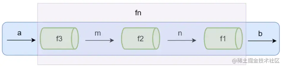 当fn比较复杂的时候,我们可以把fn拆解成多个小函数,此时多了中间运算过程产生的m和n。下面这张图可以想象成fn这个管道拆分成了3个子管道f1、f2、f3 。数据a经过管道f3得到结果m ,m再通过f2得到结果n,n通过f1得到最终的结果b 。