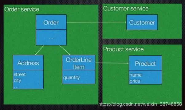 让我们用具体的例子来看一下。在下面的例子中,有三个微服务,“Order Service”, “Customer Service” 和“Product Service”。