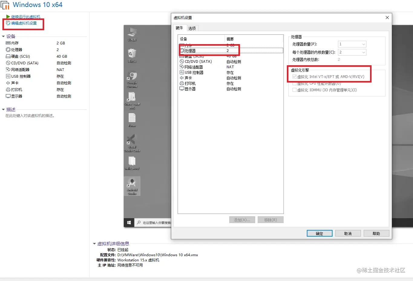 打开VMware Workstation Pro,找到要编辑的虚拟机,依次点击编辑虚拟机->处理器->虚拟化 Intel VT-x/EPT 或 AMD V/RVI(V)