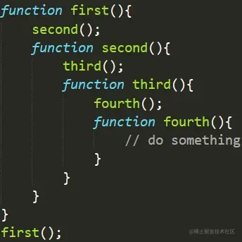 (1)运行示例代码将会导致嵌套的函数被从上倒下执行,一直到 fourth 函数,此时作用域链从上到下为: fourth, third, second, first, global。