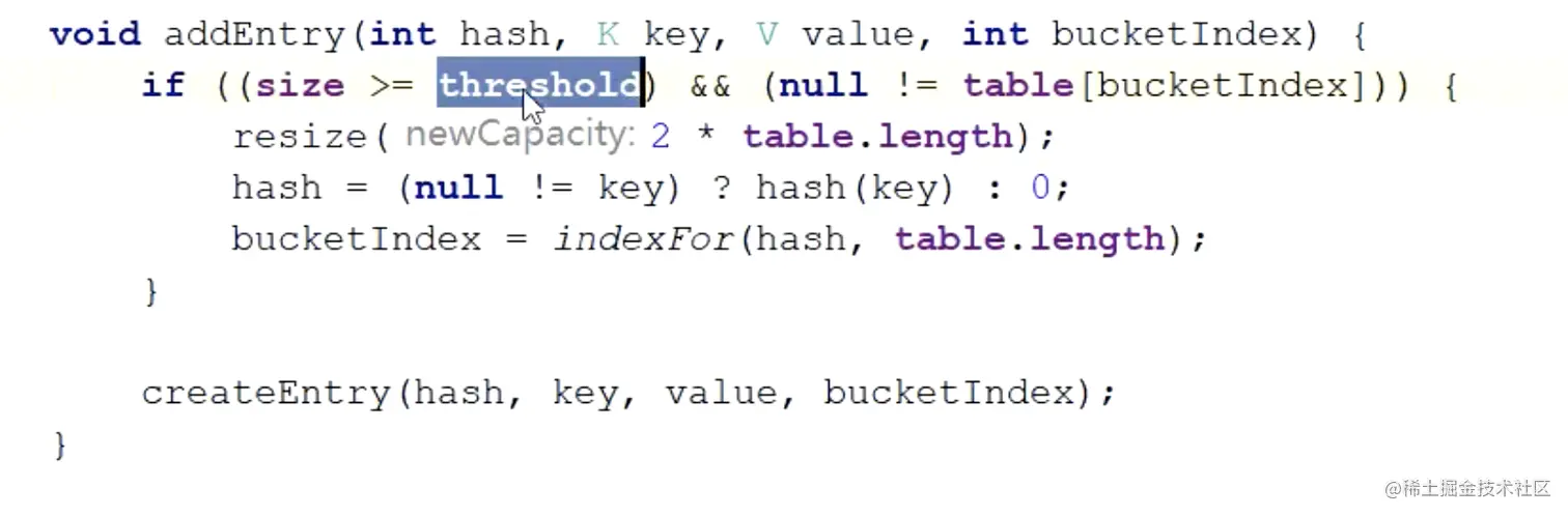 1当size大于或者等于数组的初始化容量*0.75的时候并且当前索引所在的数组不为null的时候进行扩容