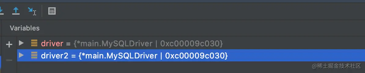 就不需要直接构造 MySQLDriver ,而是通过GetDriver() 函数来获取,通过 debug 也能看到 driver 和 driver1 引用的是同一个内存地址。
