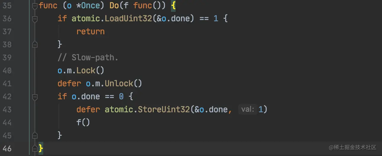 查看源码会发现 once.Do() 也是通过锁来实现,只是在加锁之前利用底层的原子操作做了一次校验,从而避免每次都要加锁,性能会更好。