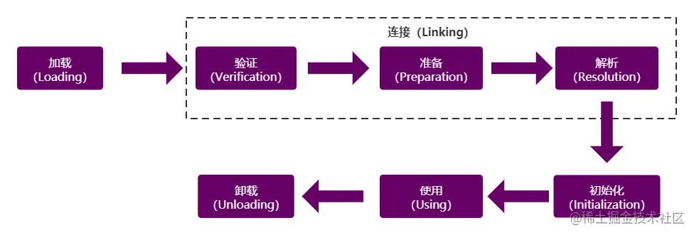 一个类型从被加载到虚拟机内存中开始,到卸载出内存为止,它的整个生命周期将会经历加载(Loading)、验证(Verification)、准备(Preparation)、解析(Resolution)、初始化(Initialization)、使用(Using)和卸载(Unloading)七个阶段,其中验证、准备、解析三个部分统称为连接(Linking)。