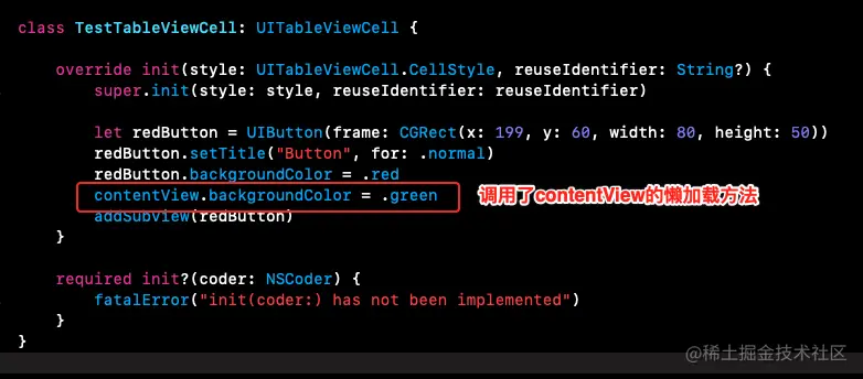 只是在addSubView(redButton)之前随便调用一下contentView的lazy方法,这里就设置个绿色的背景色。