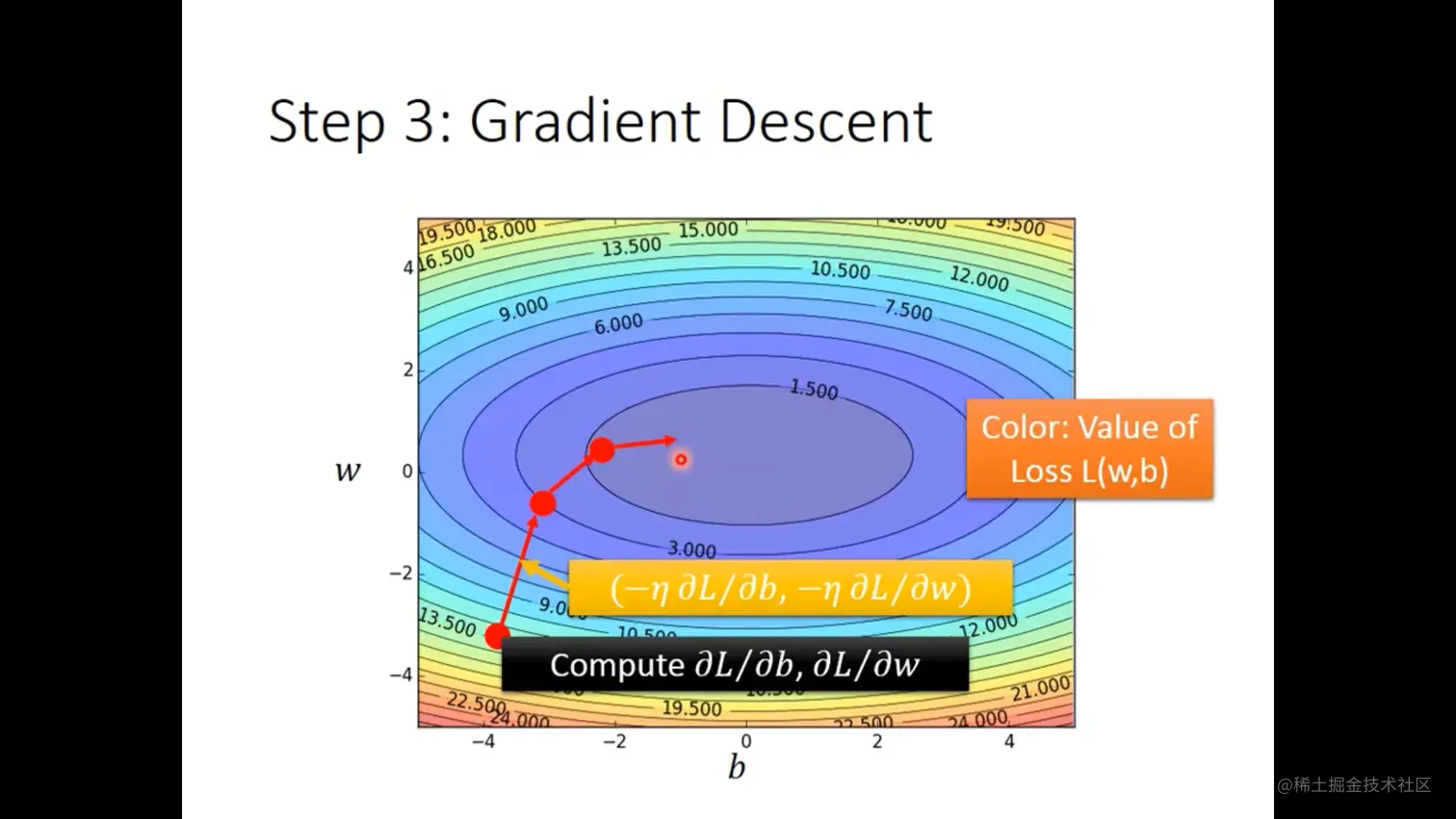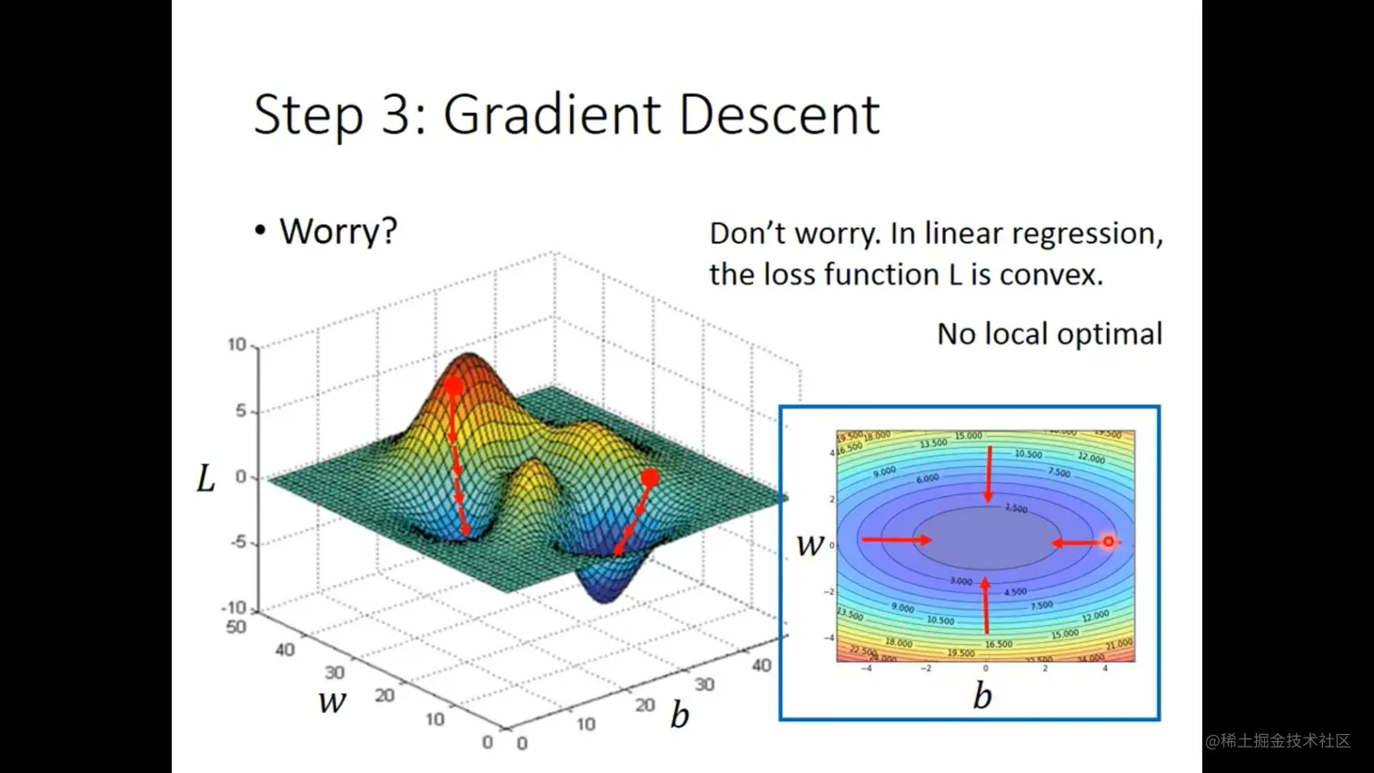 但是后续中发现它在linear regression中是一个凸函数,是没有局部最优解的。图像就像是等高线图,每更新一步调整一次“角度”,也就是斜率,直到抵达“山底”。