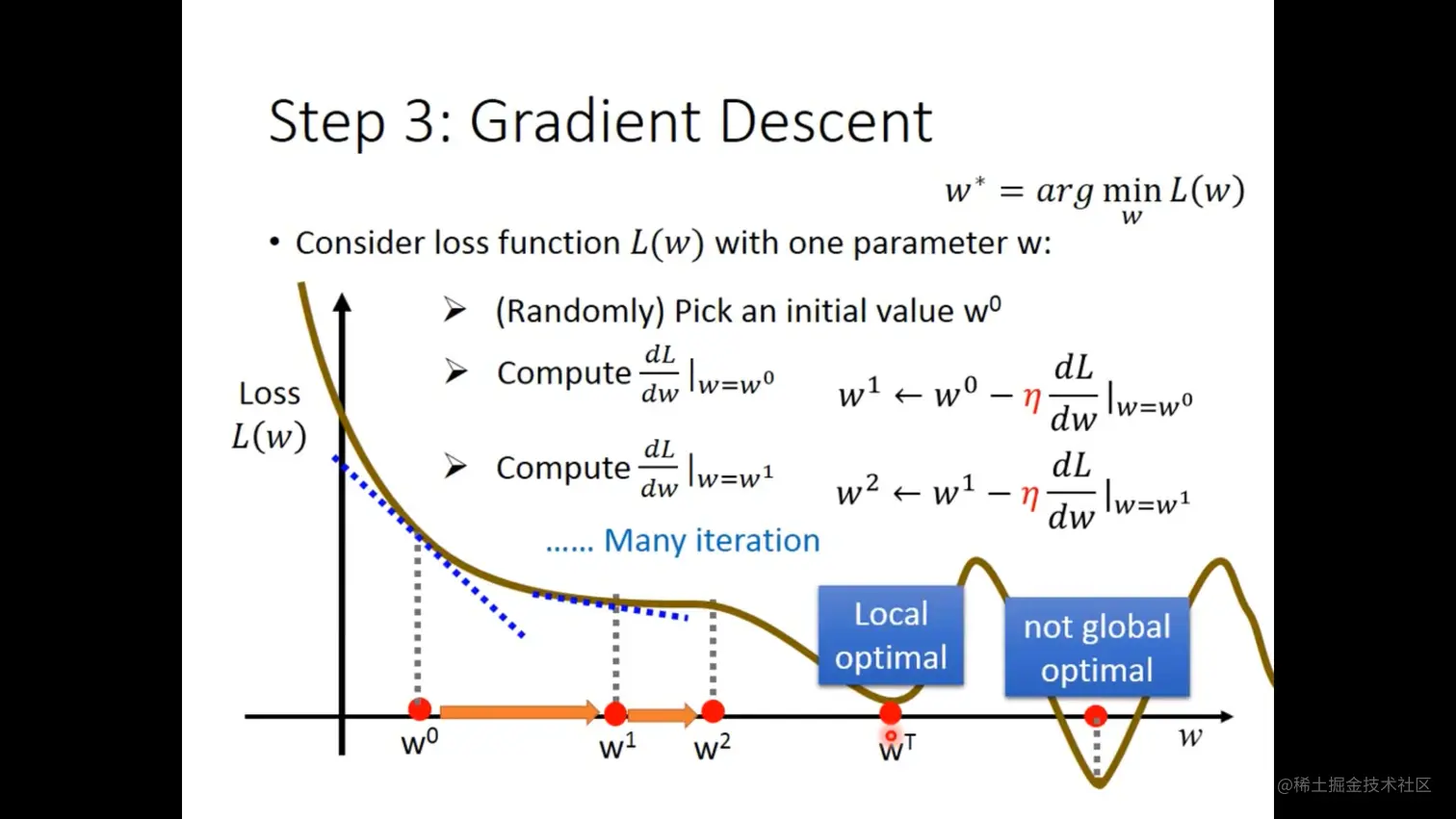 其实道理很简单,就是要找到一个全局最优解,通过一步步的不更更新w来实现,这个过程就像是下山,你确定了要下山,那就要选择一个坡度向下的路线往下走,梯度下降也是这个原理。(图为只有一个参数w时)