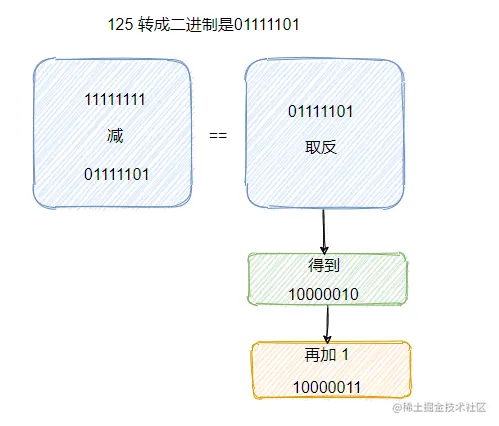 我们拿 125 来举个例子,125 二进制表示是 01111101,求 1 的补数就是 11111111 - 01111101,这个减法在二进制中不需要,因为这其实就是求反,还记得上文提到的反向器吗?