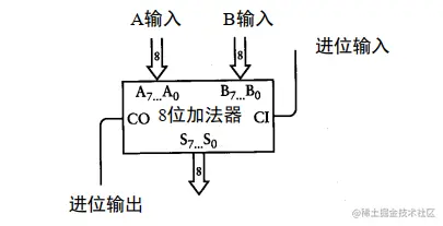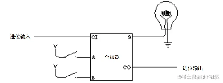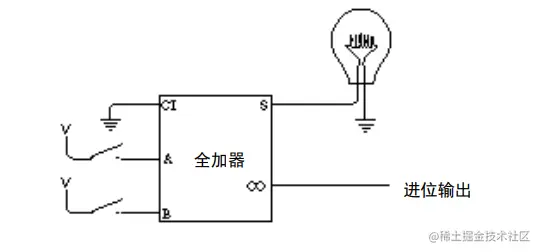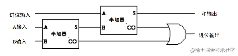 那为什么叫半加器?因为只能一位一位的加,而前一位的进位参与不到下一位的计算,如果要加入进位那下一位的运行就是 A 的当前位 + B 的当前位 + A 和 B 之前的进位。