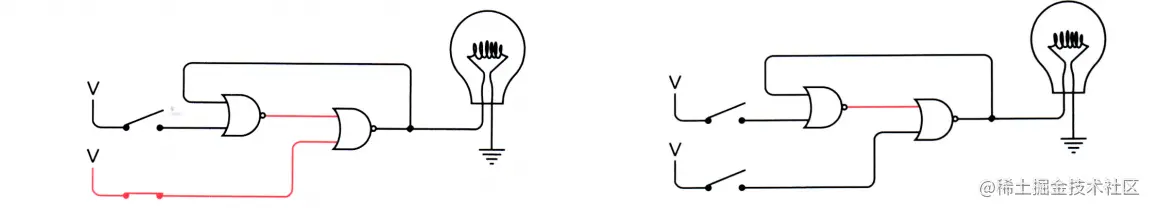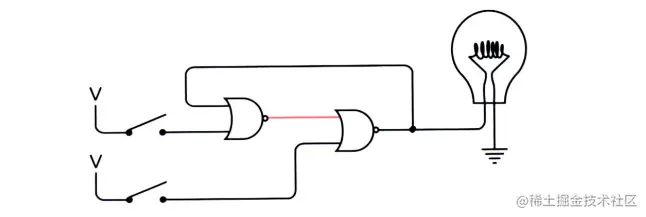 此时灯泡是不亮的。当上面的开关闭合后,左边的或非门输出 0 ,右边的或非门输出是 1,因此灯泡亮了。 神奇的地方来了,此时你断开上面的开关,灯泡依然是亮的,因为左边的或非门输出还是 0,而或非门只要有一个输入是 1,输出就是 0 。
