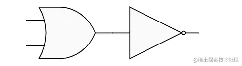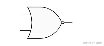 只有当两个开关都断开的情况下灯泡才会亮,任何一个开关闭合灯泡都会熄灭,这个操作和 OR 操作相反,称之为 NOR 即或非门,简化后的符号比或门多了个小圆圈,代表反向。