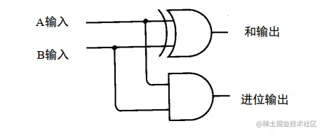 所以加法需要通过两个逻辑门,分别是异或门来操作当前和,与门来操作进位,结合起来如下图所示: