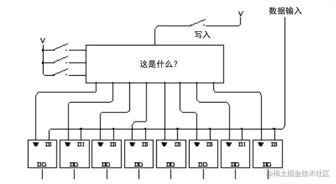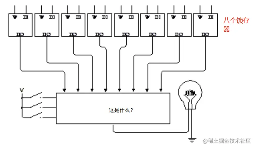 比如现在我们有一个灯泡,想测试一下八个锁存器,八个锁存器的话那么需要 3 个开关来表示具体选择哪个锁存器,2 的 3 次方等于8。