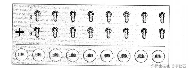 这就是一个 8 位的计算器,有 9 个灯是因为两个 8 位相加结果可能是 9 位。