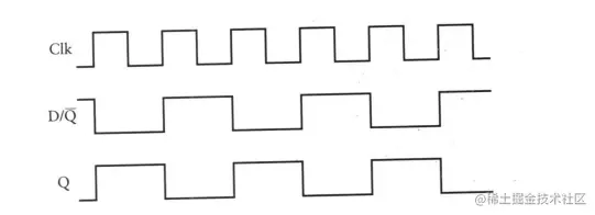出来的波形图是这样的,可以看到 Q 的输出频率是时钟的一半,所以这种电路称为分频器。