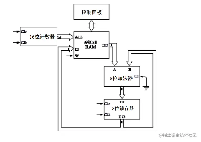 可以通过控制面板先往存储器里面写好要操作的值并且可以通过控制面板上的灯来查看内存写入结果,然后一开始访问存储器的地址为 0000,由计数器来驱动地址的前进,然后进行相加,最终将结果存储回 RAM 阵列中,当然也需要设置停止信号。