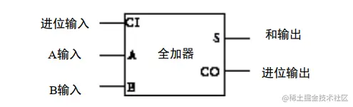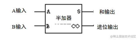 假设 A 输入 1 , B 输入 1, 进位输入 1,从最左边开始第一个半加器 S 输出 0 , CO 输出 1,第二个半加器 S输出 1,CO 输出 0,最终和输出 1,进位输出 1,结果没毛病可行,这叫全加器,简化一下图: