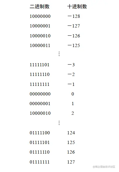 拿八位二进制数来说,范围是 0000000011111111, 对应的十进制是 0255,但现在我们想让它能表示负数,前面十进制的时候我们将 5、6、7、8、9开头的正数来表示负数,对应于二进制我们可以将第一位以1开头的作为负数。