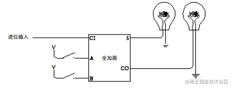 全加器有了,咱们得组合起来,并且需要有输入和输出,我们通过开关来输入数字,由灯泡的亮暗显示结果。