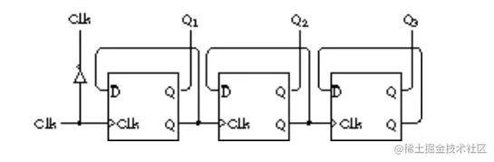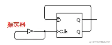 将振荡器的输出作为时钟的输入,然后反向 Q 端(上图中下面的Q代表反向Q,图少了一横)的输入又作为 D 的输入。