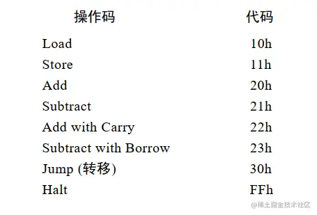 这个操作码仅是个助记符,因为地址是固定的,并且操作码指令字节是固定长度(1个字节),所以我们可以在每条操作后面跟上地址,总的而言每条指令(除停止)需要 3 个字节。