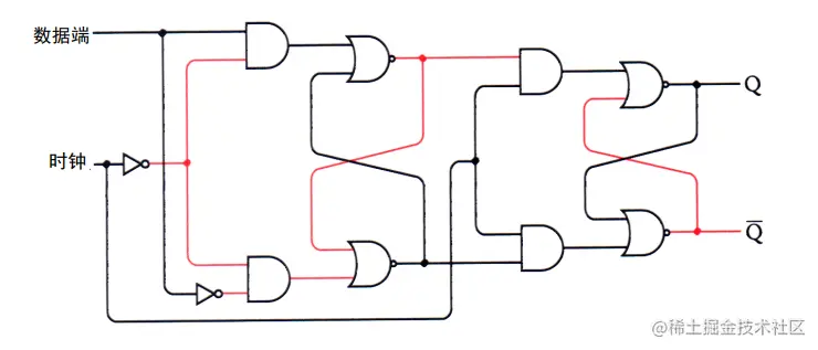 这个叫电平触发的D型触发器,D表示 Data,数据的输入。电平触发就是当保持位为某一个特定电平时 (例子是 1),触发器就会保存数据端的输入值。