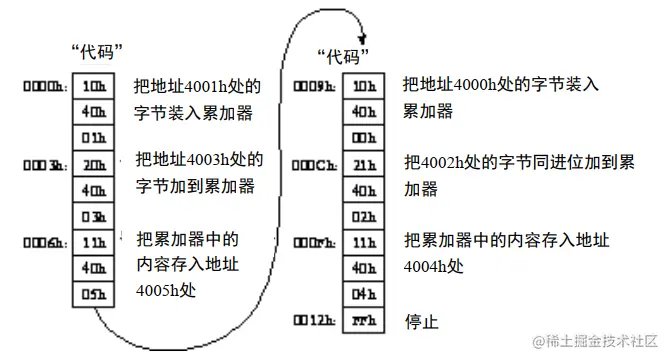 有了累加器之后,我们可以将存储器的值传到累加器中,称为 Load 装载,把下一个值添加到累加器中,称为 Add,然后将结果保存在某个位置,称为 Store。