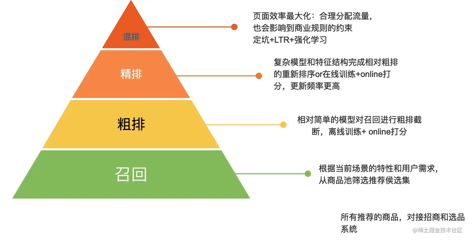下面说一下召回和粗排/精排的区别。从召回到粗排再到精排模块,商品的数据量是递减的,模型的复杂度会增高。具体会体现在输入特征数量和模型复杂度的增加,更新往往也会更频繁。对应的训练和上线的方式也会不同,拿召回来讲,出于性能的考虑,往往采用离线训练+打分或者离线训练得到向量表达+向量检索的方式,而排序阶段为了更好的准确率和线上指标,更多的是离线训练+实时打分,甚至在线学习的方式。