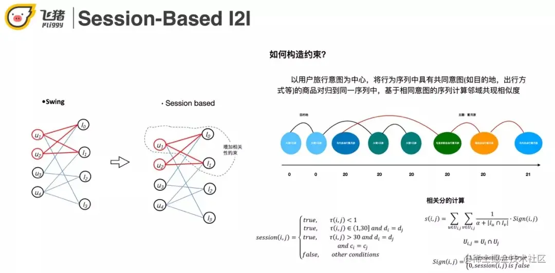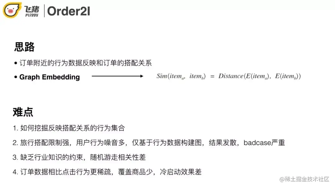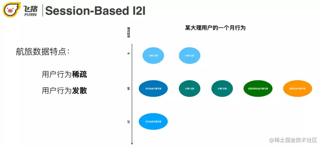 - 相关性vs搭配性:航旅场景下要求搭配性比较高,传统的I2I只偏重相关性。但用户的行程需求不是单点的,比如买了飞机票还要看住宿。行程受上下文影响比较多,比如季节、用户近期行为等。