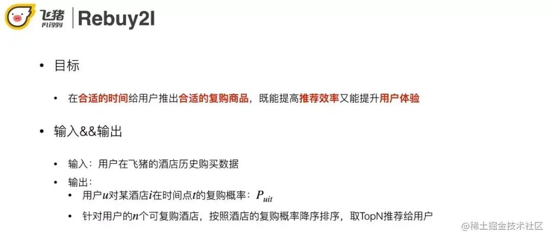 输入用户在飞猪的酒店历史购买数据,输出是用户在某个时间点对某个酒店的复购概率。当有多个可复购酒店时,按照概率降序排序。