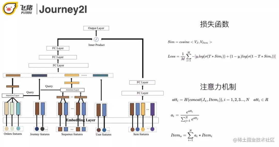 以行程为粒度,对多个订单做聚合,并且增加行程相关的特征。融入用户的基础属性特征和历史行为序列。丰富行程特征并引入attention机制。采用双塔模型离线存储商品向量,在线做向量化召回。模型结构如下: