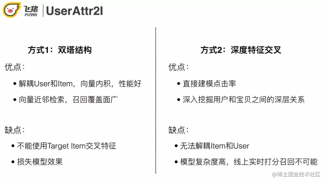 阿里飞猪个性化推荐:召回篇 在这里介绍我们的方案UserAttr2I,使用类似排序模型的方法,输入用户+商品的属性,预测用户是否会点击一个商品。