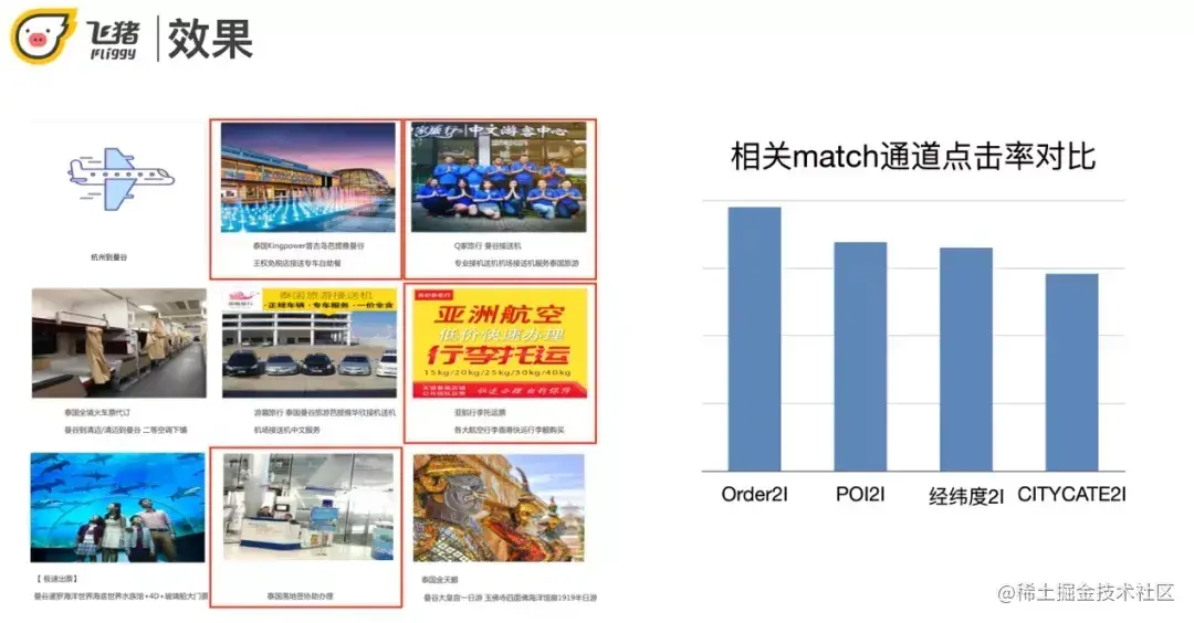 这里有一个具体的case,用户订了一张去曼谷的机票,order2I召回了曼谷的一些自助餐,落地签,热门景点等,体现了较好的搭配性。整体的指标上order2I的点击率也明显高于其他方式。