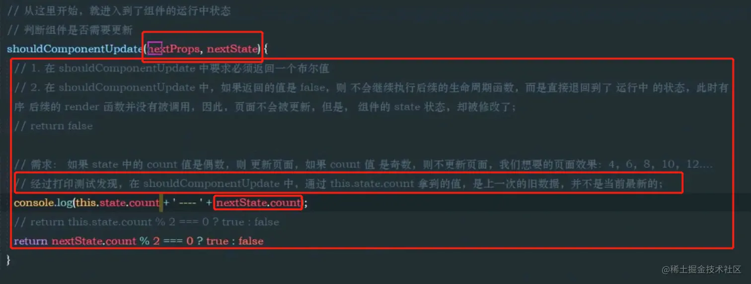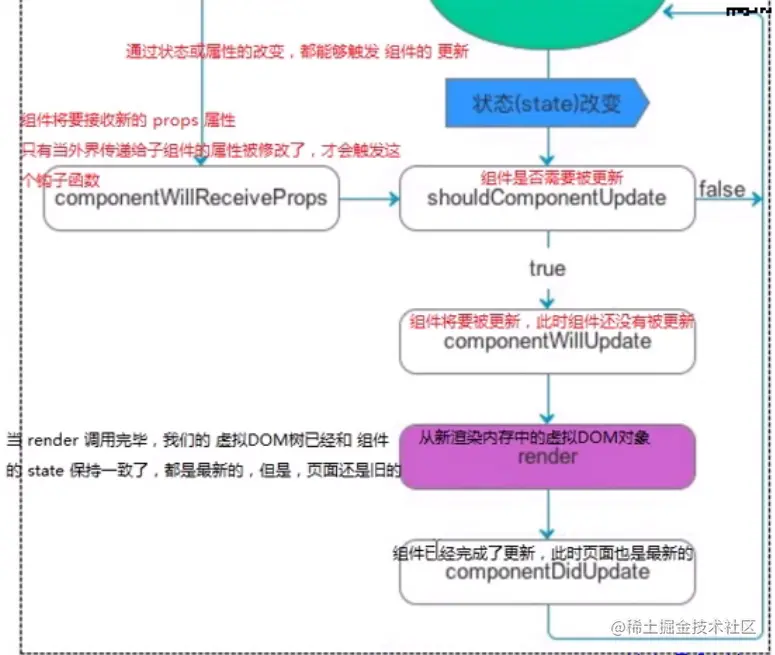 shouldComponentUpdate: 组件是否需要被更新,此时,组件尚未被更新,但是,state 和 props 肯定是最新的 componentWillUpdate: 组件将要被更新,此时,尚未开始更新,内存中的虚拟DOM树还是旧的 render: 此时,又要重新根据最新的 state 和 props 重新渲染一棵内存中的 虚拟DOM树,当 render 调用完毕,内存中的旧DOM树,已经被新DOM树替换了!此时页面还是旧的 componentDidUpdate: 此时,页面又被重新渲染了,state 和 虚拟DOM 和 页面已经完全保持同步