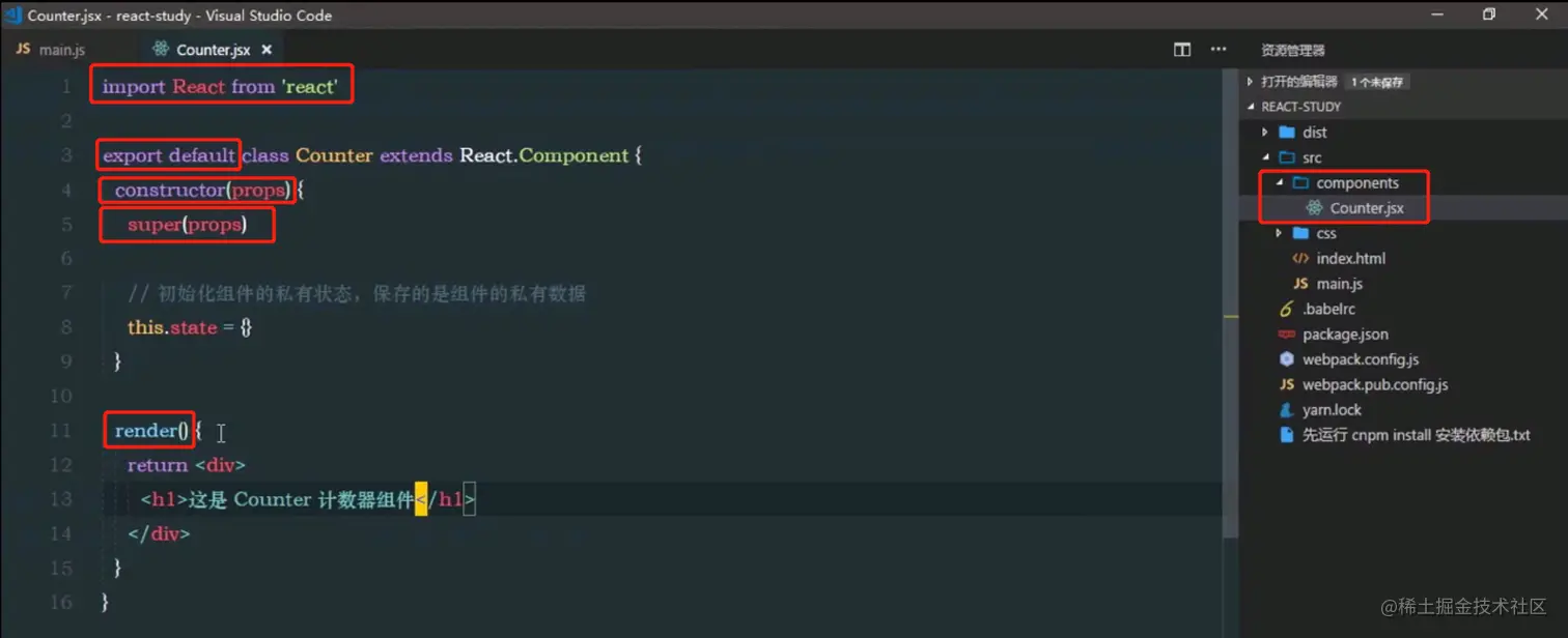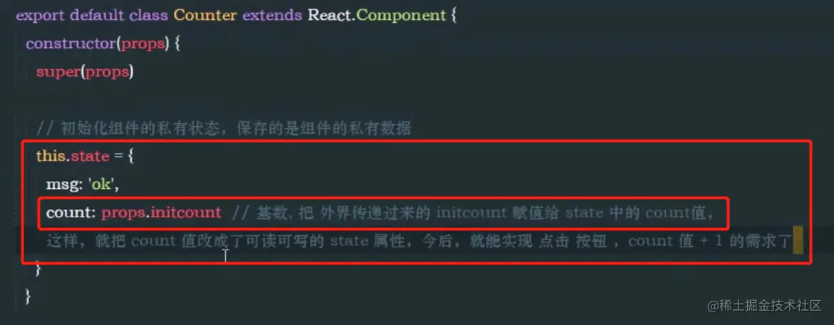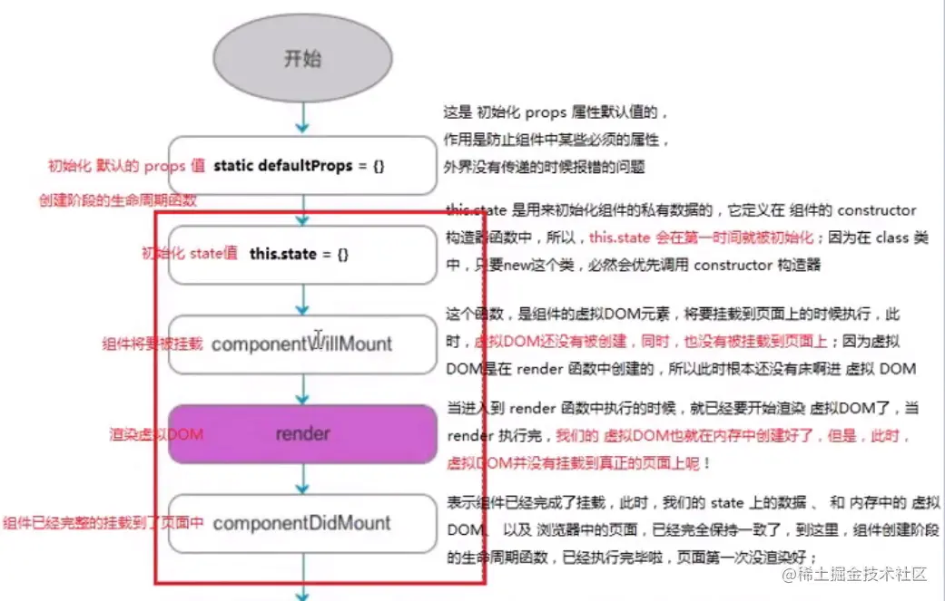 在组件创建之前,会先初始化默认的props属性,这是全局调用一次,严格地来说,这不是组件的生命周期的一部分。在组件被创建并加载候,首先调用 constructor 构造器中的 this.state = {},来初始化组件的状态。