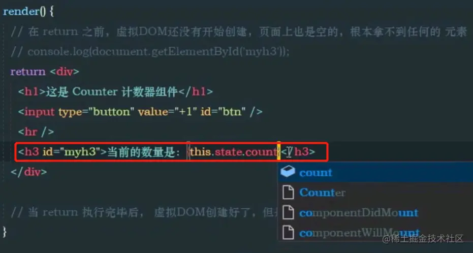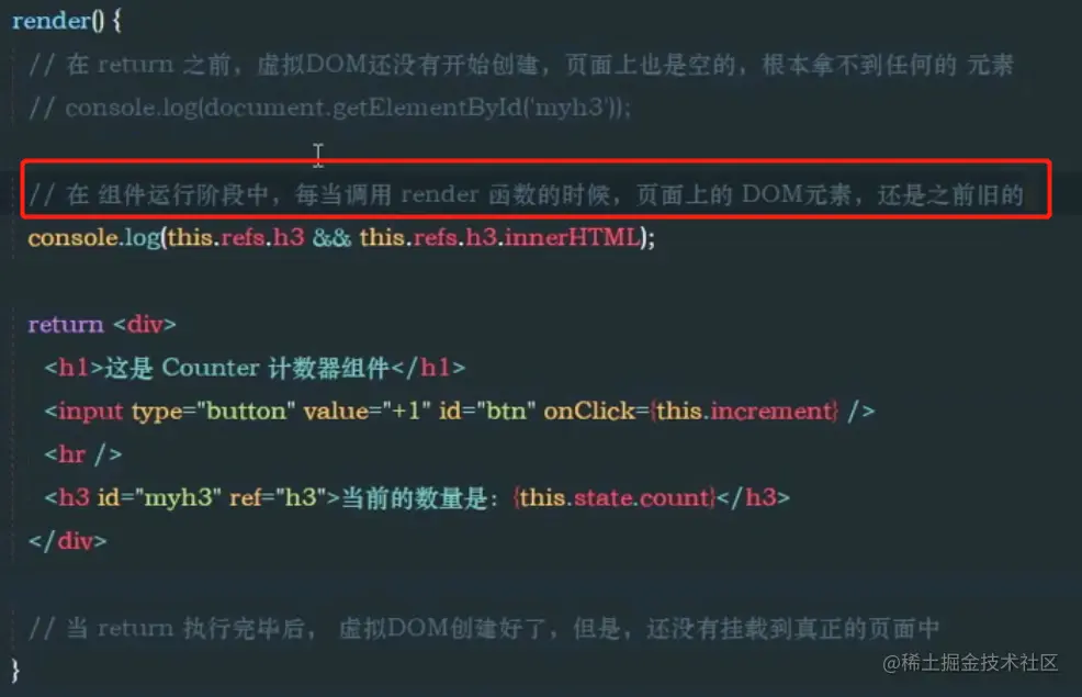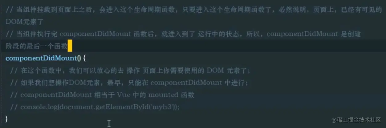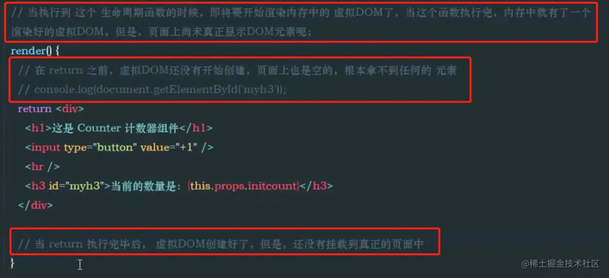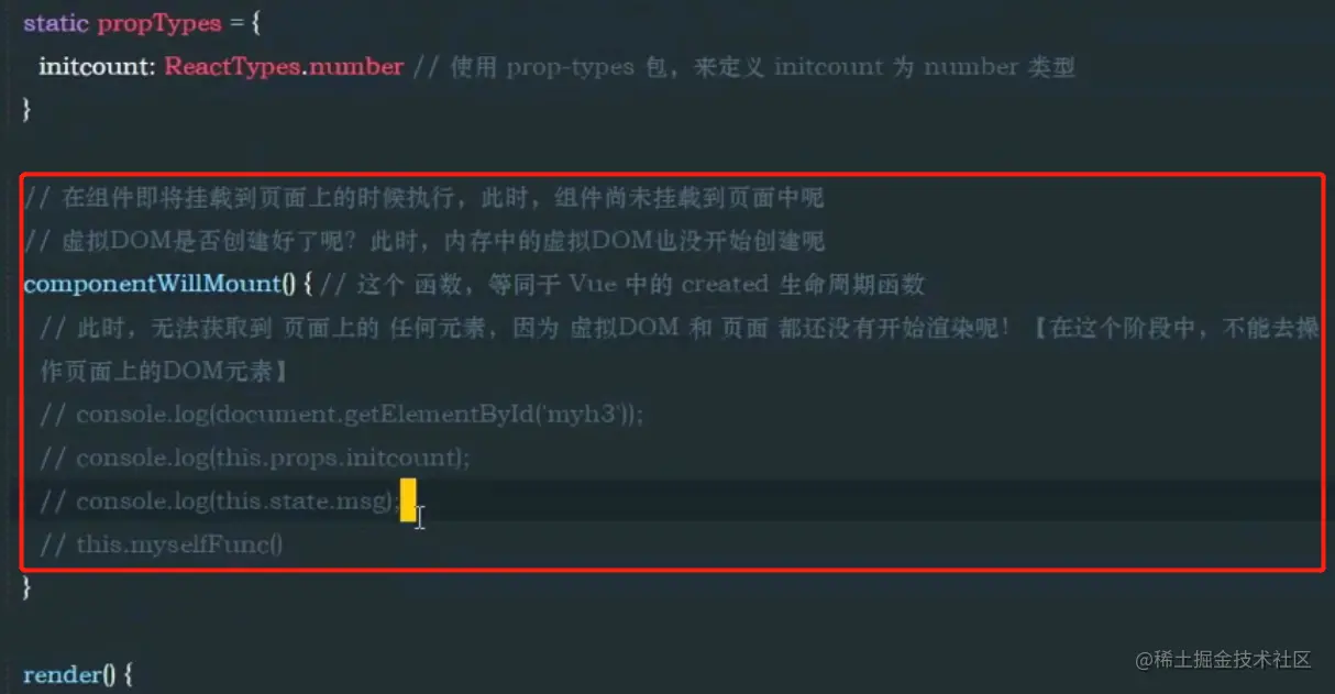 componentWillMount: 组件将要被挂载,此时还没有开始渲染虚拟DOM render:第一次开始渲染真正的虚拟DOM,当render执行完,内存中就有了完整的虚拟DOM了 componentDidMount: 组件完成了挂载,此时,组件已经显示到了页面上,当这个方法执行完,组件就进入都了 运行中 的状态